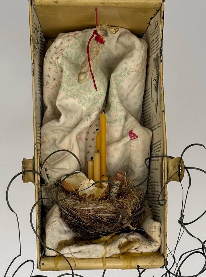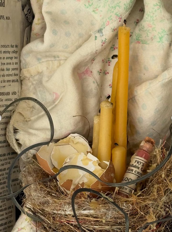The container for my assemblage is an antique doll carriage from my in-laws. I disassembled it and collaged the inside with pages from old medical encyclopedias about mental illness and child rearing. As the weekend went on, I found more and more of my deeply personal treasures in my hand. My baby blanket. The rabbit’s foot a hawk had left for me on top of a hay bale in 1978. A nest I found on the ground tucked in the center of three trees at my parent’s farm. The Blood Red pigment jar that was my great grandmother’s from her china painting days. A metal slinky that was my grandchild’s, stretched and twisted into a tangled mess. Greek Orthodox beeswax prayer candles gifted by a neighbor.