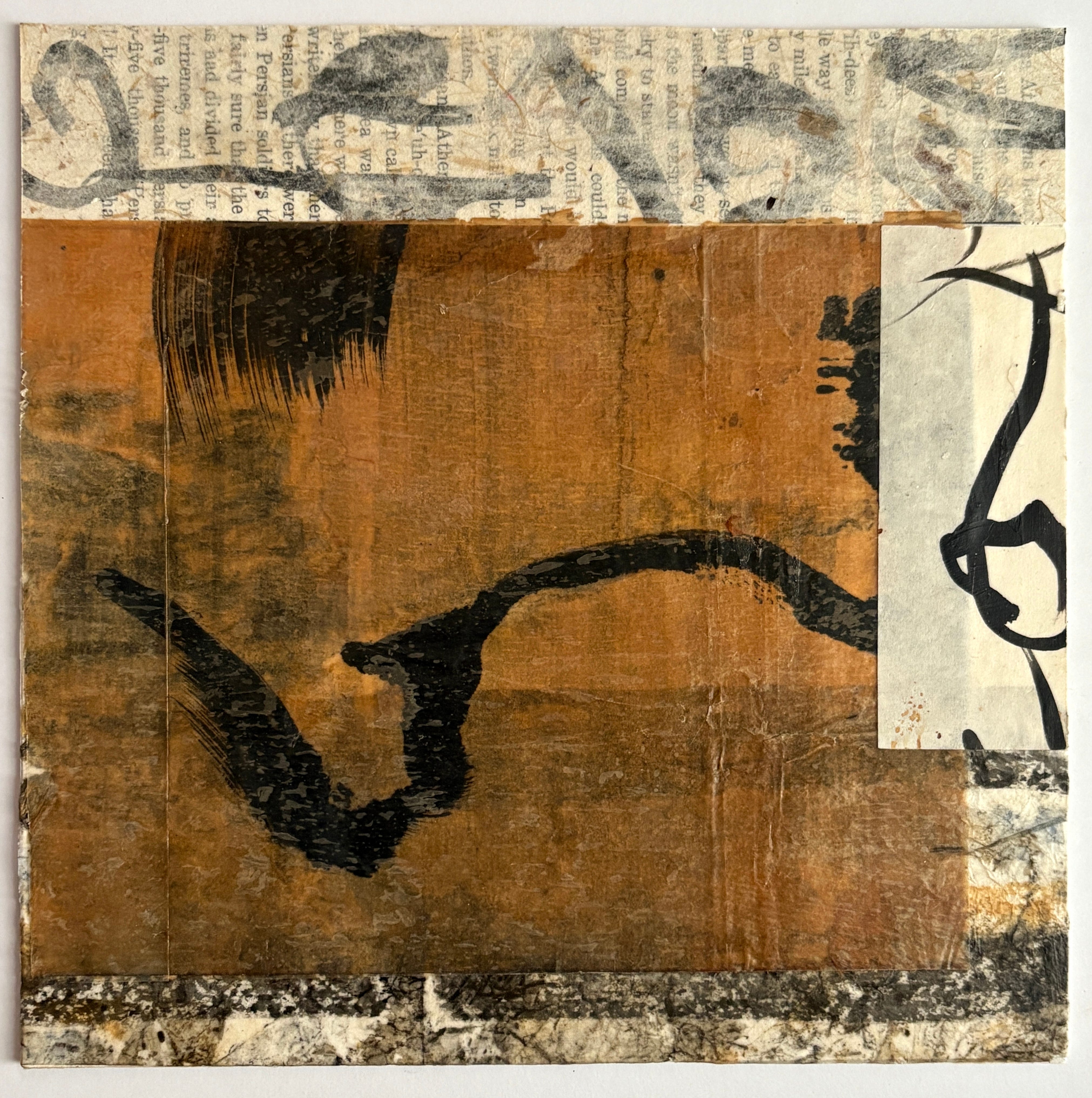 Back at my studio table, I assess the current jumble of loosely arranged fodder and decide what is ready to complete and what beginnings look promising. I tune out the weather, the traffic, the news. Here in the early morning light I settle, until coffee grows cold and there is nothing left but the steady rhythm of brush on paper and glue.